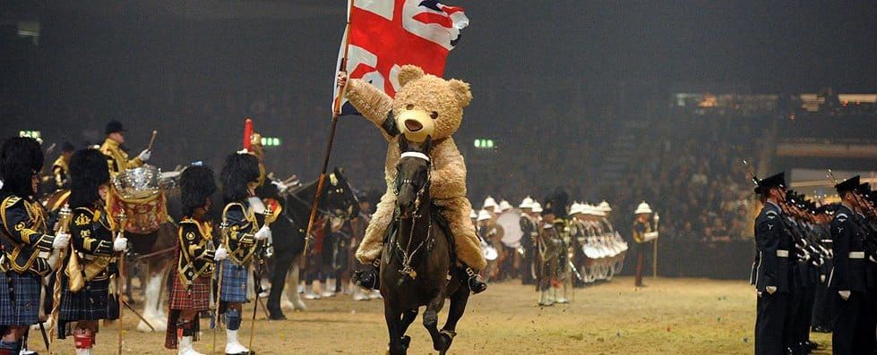Prince William, Duke of Cambridge, receives Baxterbear mascot of The British Military Tournament, formerly The Royal Tournament, for his son, Prince George future King of England.