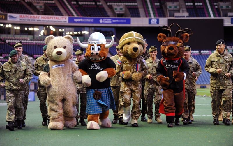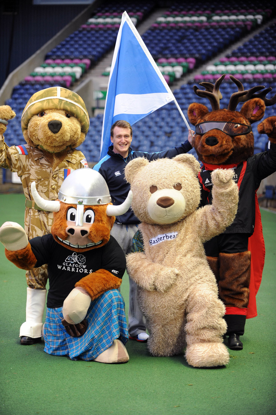 Baxterbear rushed to get to Murrayfield on time on Monday 12th November for the MASCOT challenge from a photo shoot at Edinburgh Castle. There he was TREEKLED to join his new Mascot friends pictured with him below – for Help the Heroes (Hero), Glasgow Warriors (Clyde), Edinburgh Rugby (Flinty), and last but not least Scotland Full Back Stuart Hogg.